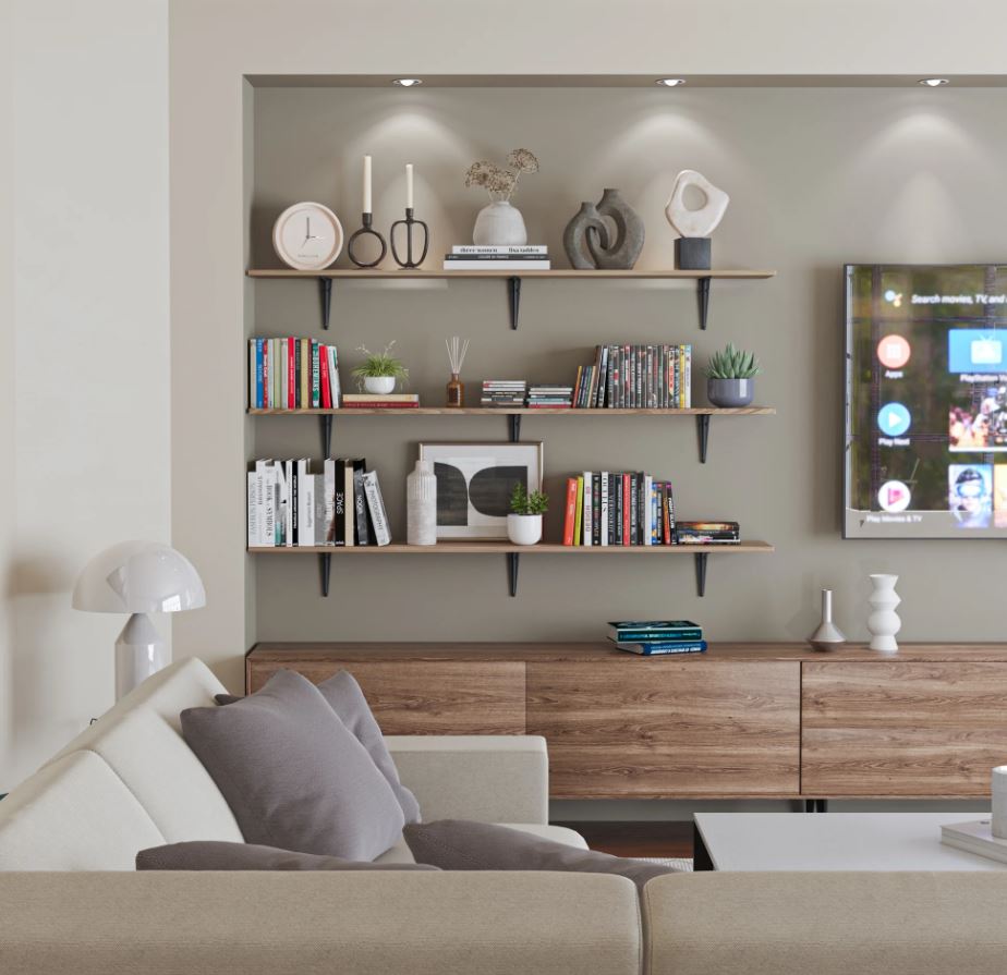 Floating shelves not only help reduce clutter but also serve as curated showcases that elevate the entire room’s aesthetic.